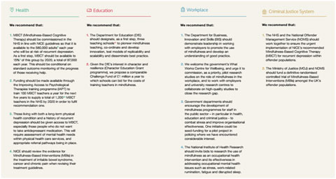 Mindful Nation UK 2015-ben az Egyesült Királyság / Nagy-Britannia törvényhozásának „Mindfulness Összpárti Parlamenti Munkacsoportja” (Mindfulness All-Party Parliamentary Group - MAAPG) szakértõk meghívásával zajló parlamenti meghallgatások valamint parlamenti képviselõk és szakértõk részvételével zajló 1 évig tartó háttérmunka összefoglalásaképpen egy közel 50 oldalas jelentést (Mindful Nation UK Report) készített a brit kormány és a Parlament számára, melyben konkrét javaslatokat fogalmaztak meg a mindfulness módszerek társadalomban történõ elterjesztésére vonatkozóan. A jelentés 4 területet jelöl meg, ahol a mindfulness módszerek elterjesztése kívánatos lenne, mely az egész társadalom számára pozitív eredményeket hozna: